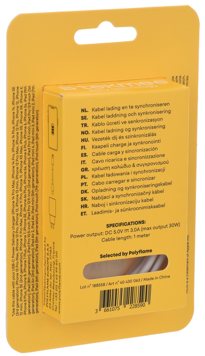 TEKMEE Lightning Kabel, Made for iPhone, Litghtning/Type-C, Fast Charge, 3,0A ,1m, charg sync, weiß, in 12er Abpackung (Blister mit EAN)