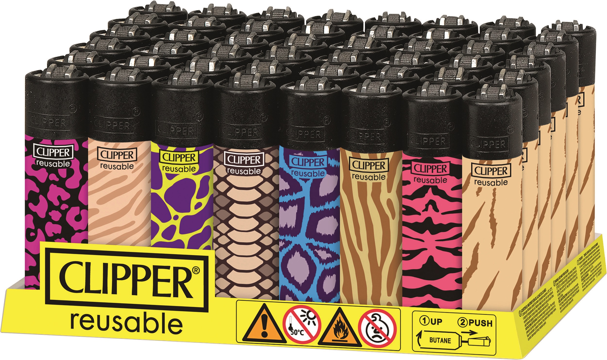 Clipper-Feuerzeug, nachfüllbar, im 48er Aufsteller, Feuerzeuge mit EAN, kindergesichert. Motiv: Animalprint