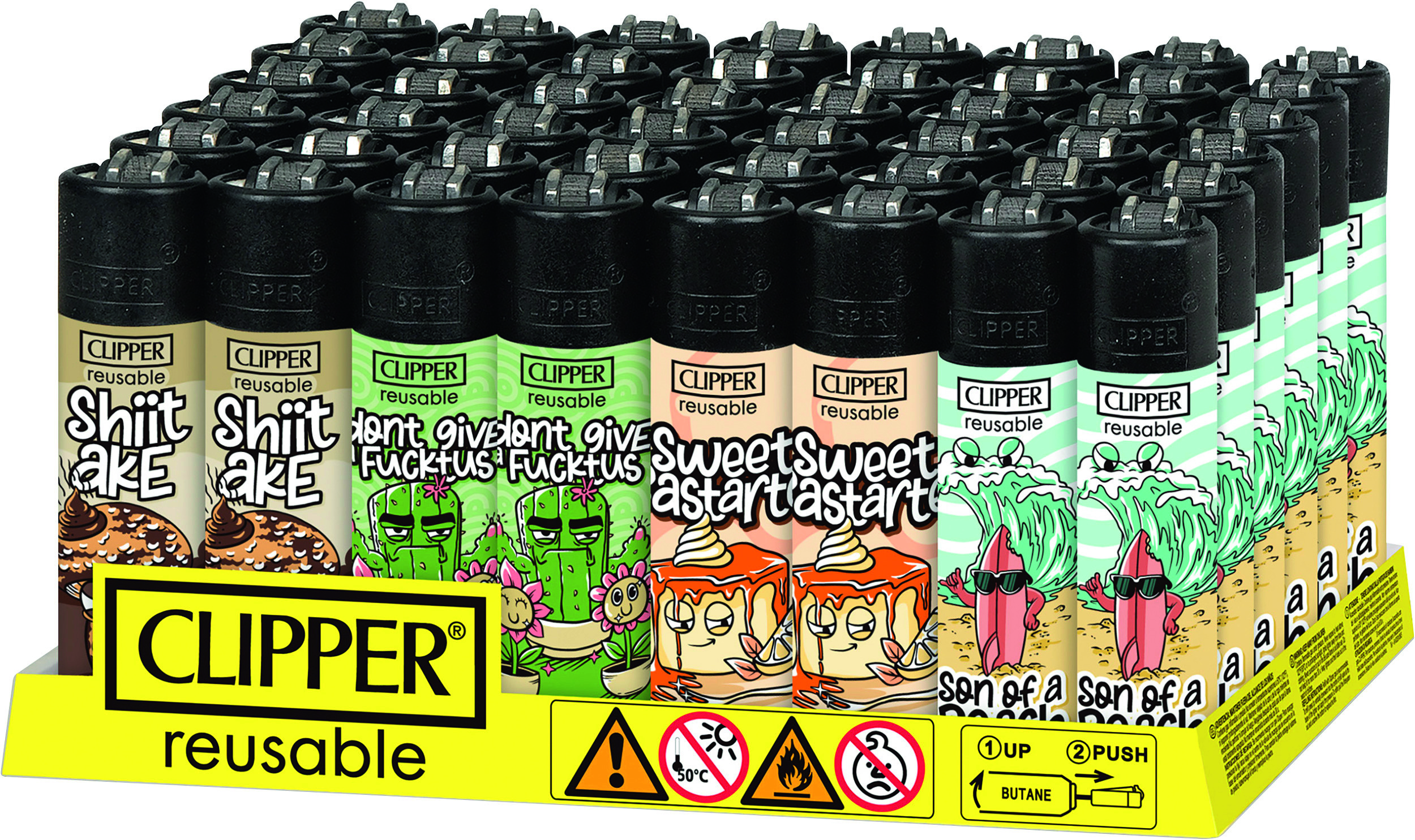Clipper-Feuerzeug, nachfüllbar, im 48er Aufsteller, Feuerzeuge mit EAN, kindergesichert. Motiv: Fucktus