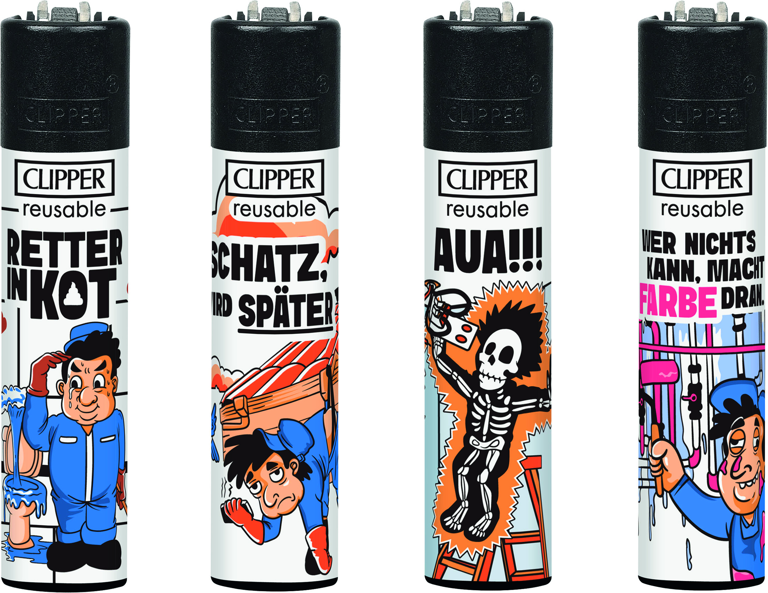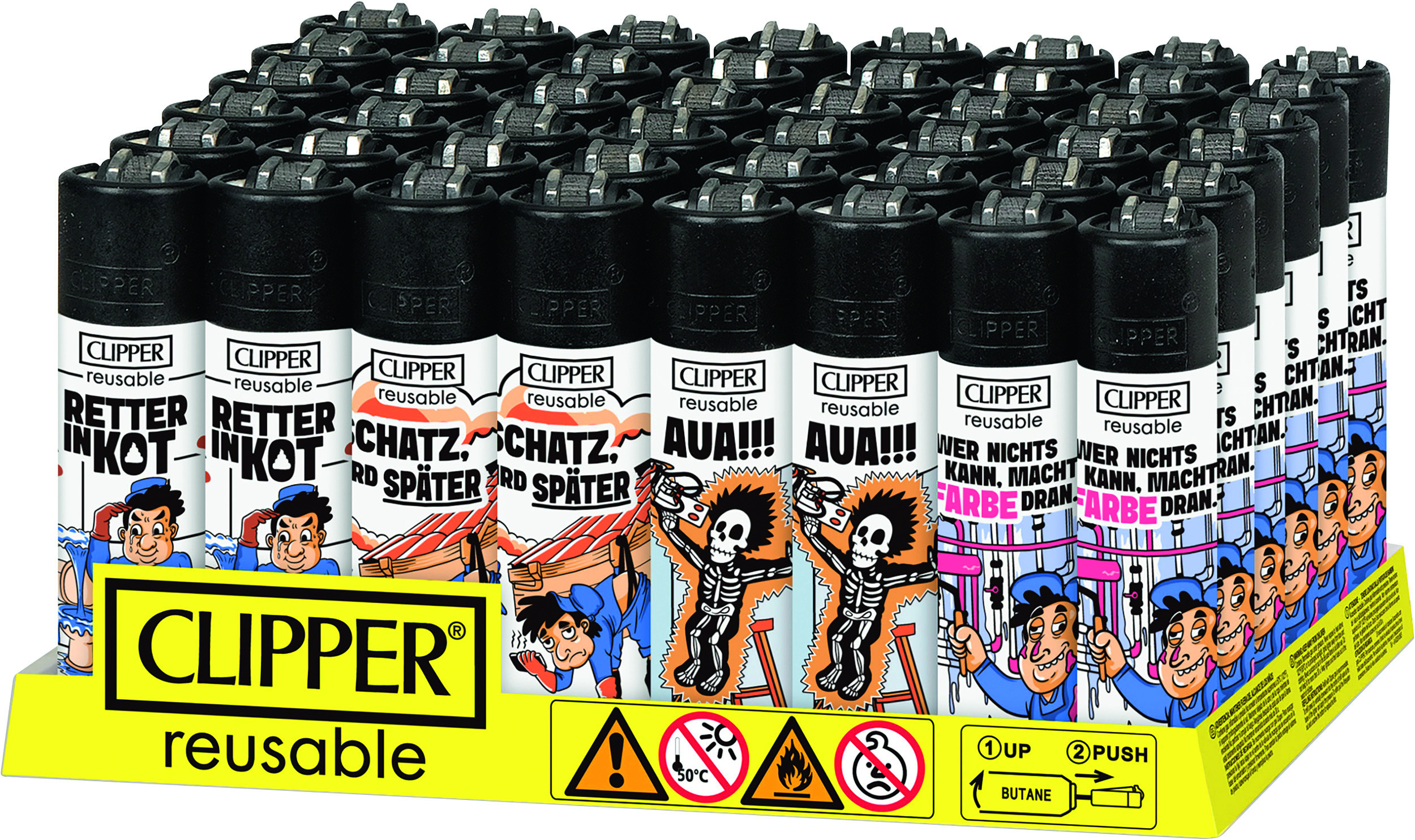 Clipper-Feuerzeug, nachfüllbar, im 48er Aufsteller, Feuerzeuge mit EAN, kindergesichert. Motiv: Handwerker 3