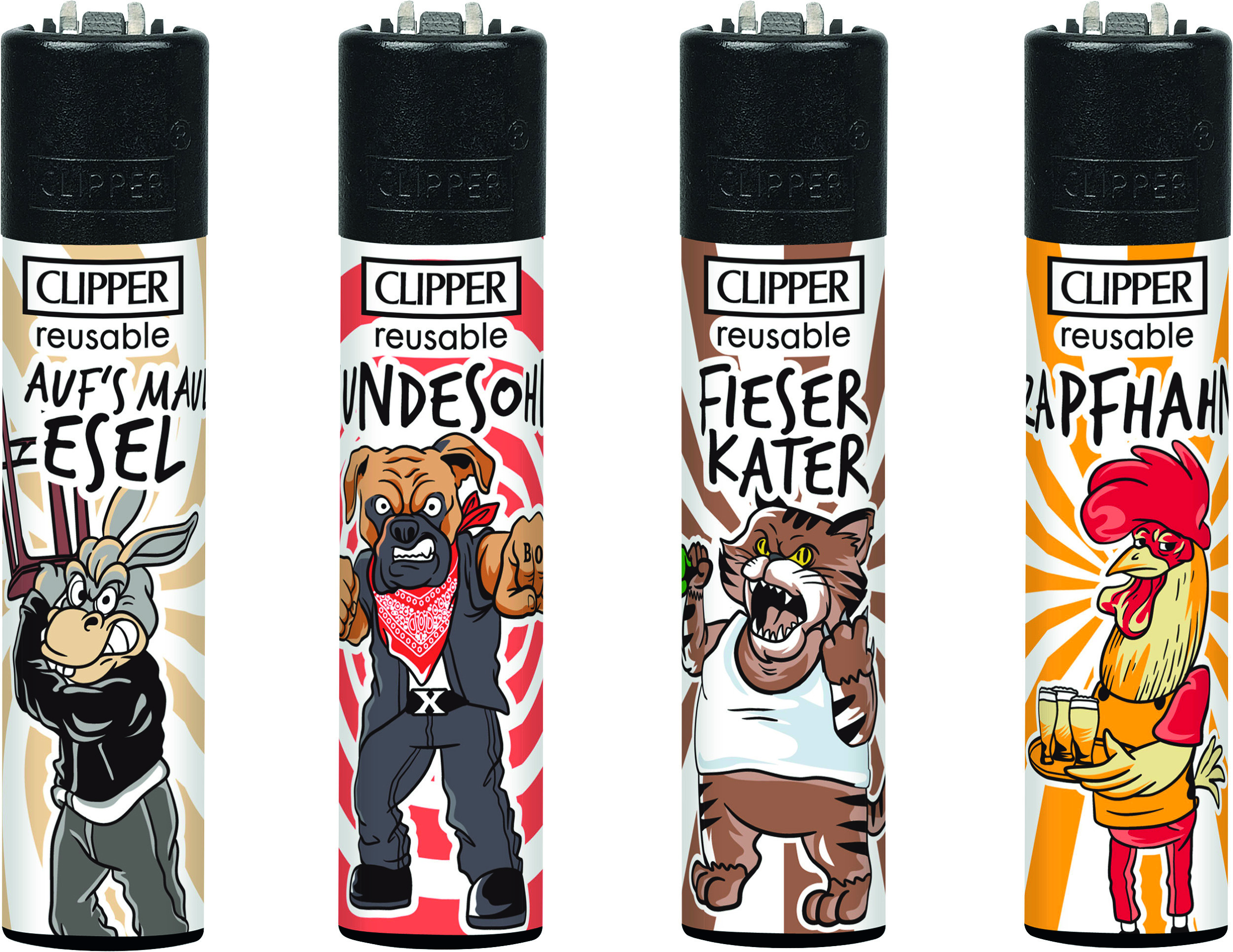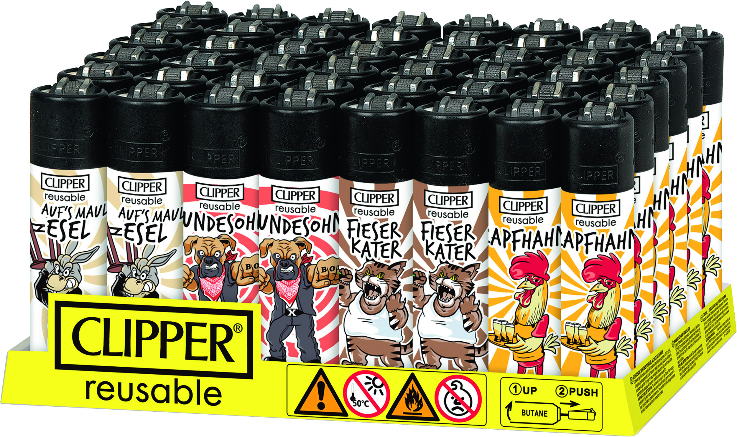 Clipper-Feuerzeug, nachfüllbar, im 48er Aufsteller, Feuerzeuge mit EAN, kindergesichert. Motiv: Stadtasikanten