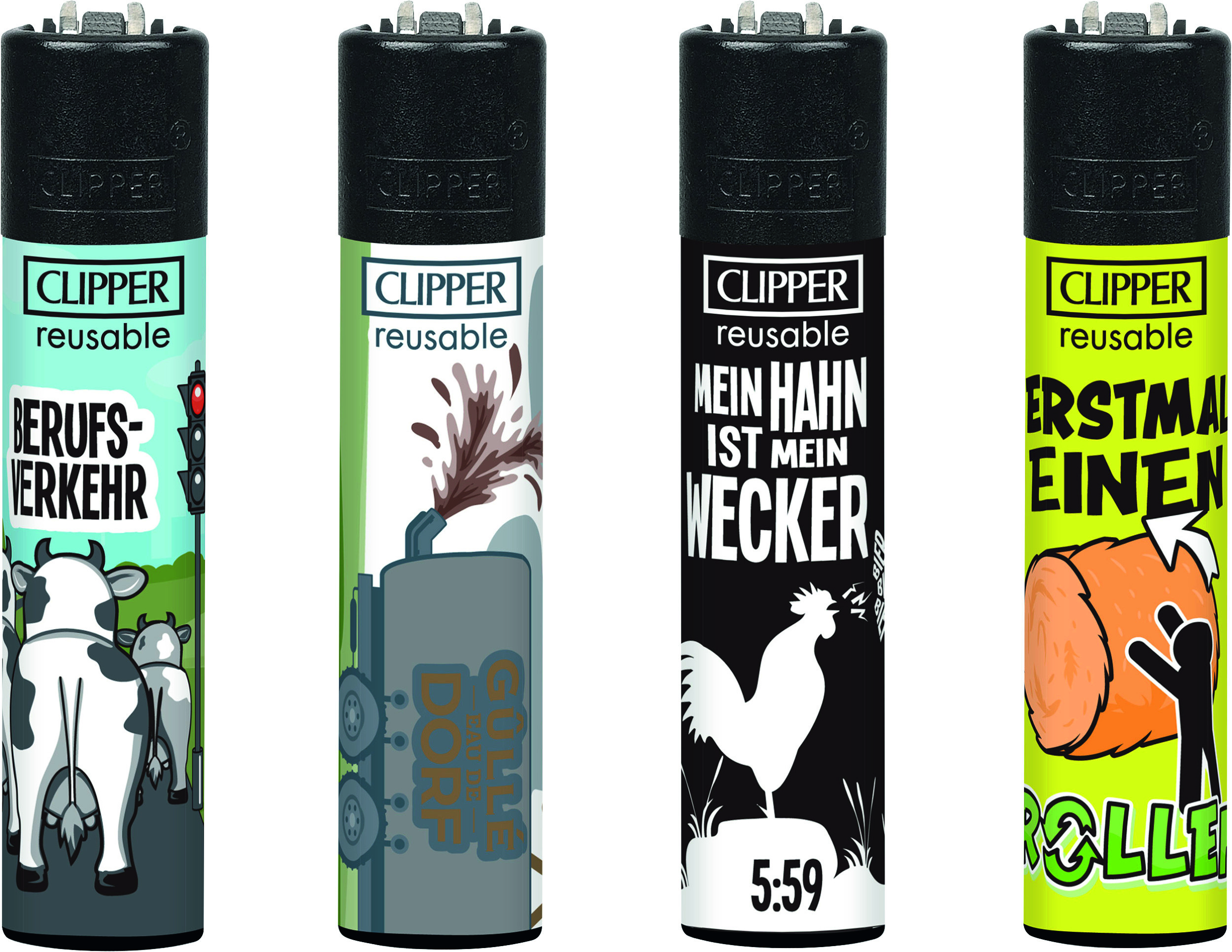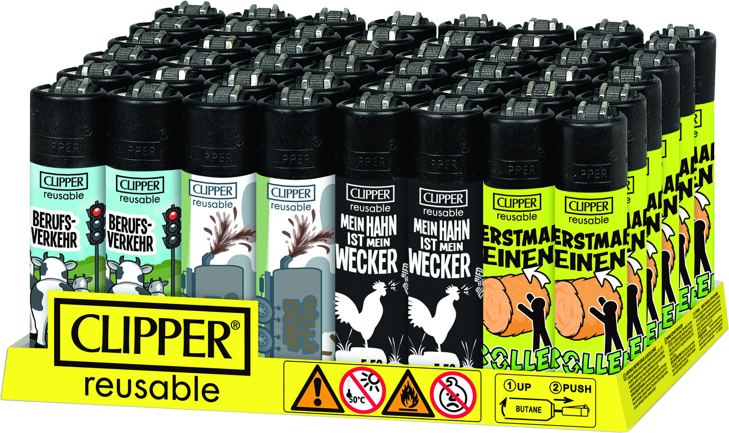 Clipper-Feuerzeug, nachfüllbar, im 48er Aufsteller, Feuerzeuge mit EAN, kindergesichert. Motiv: Dorfleben 2