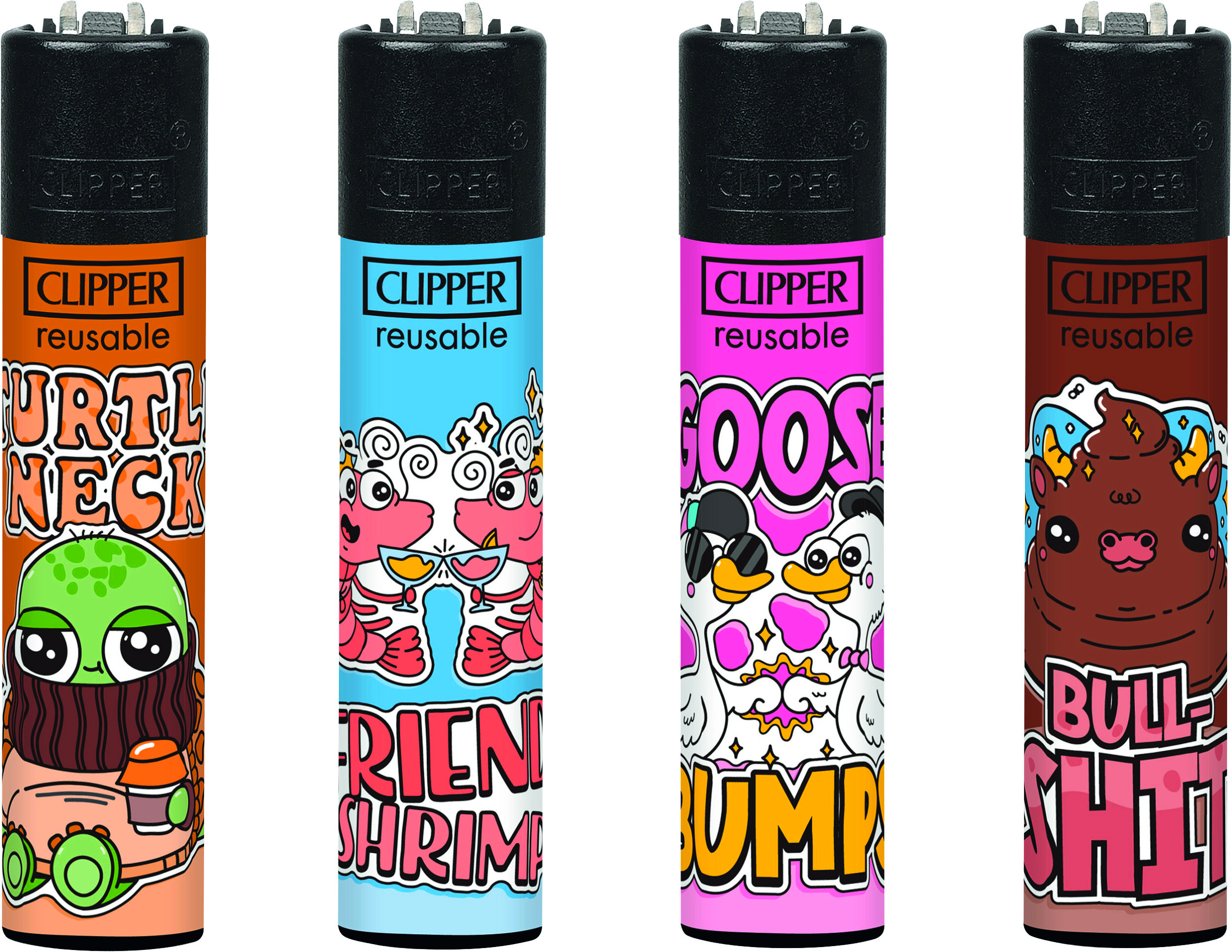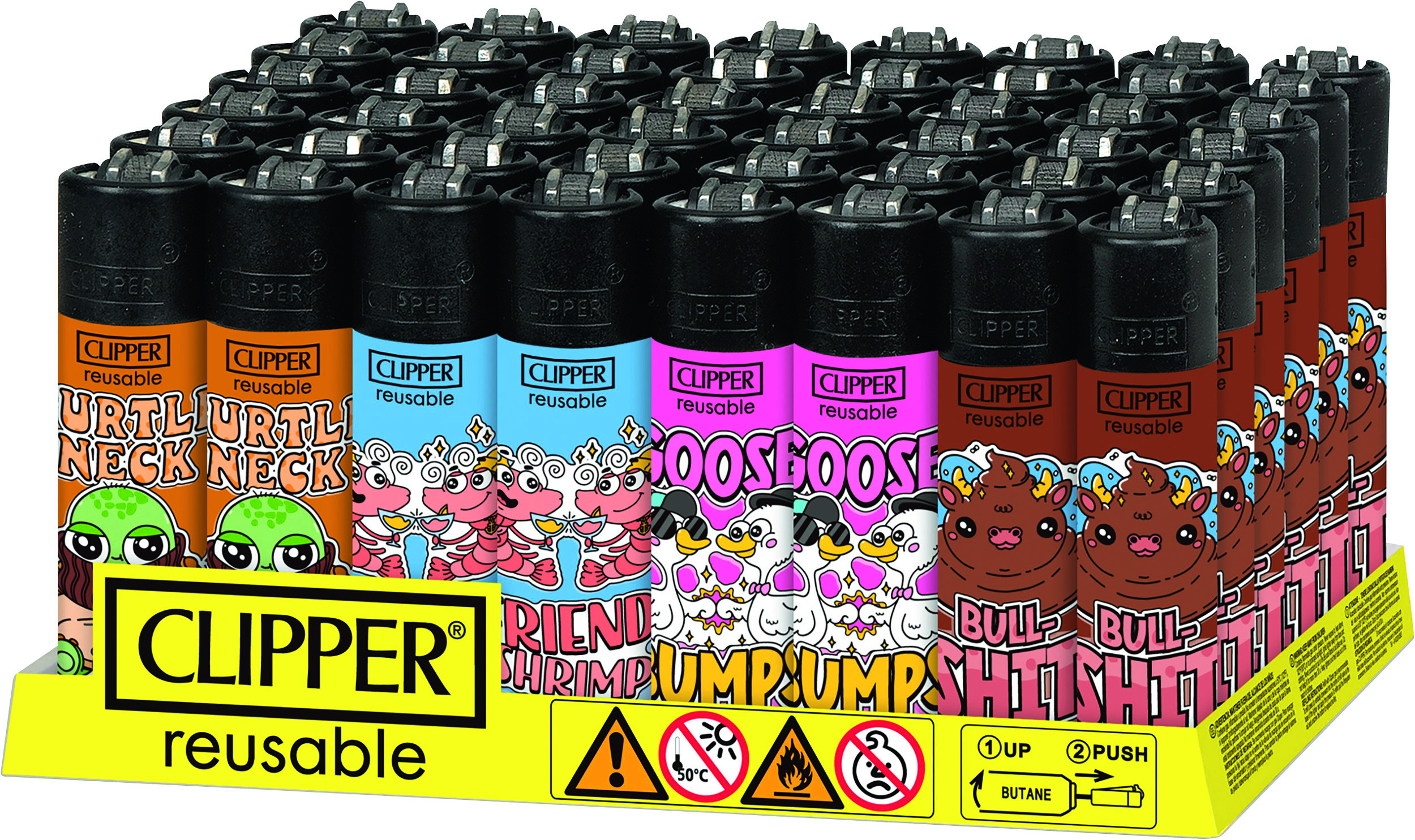 Clipper-Feuerzeug, nachfüllbar, im 48er Aufsteller, Feuerzeuge mit EAN, kindergesichert. Motiv: Friendshrimp