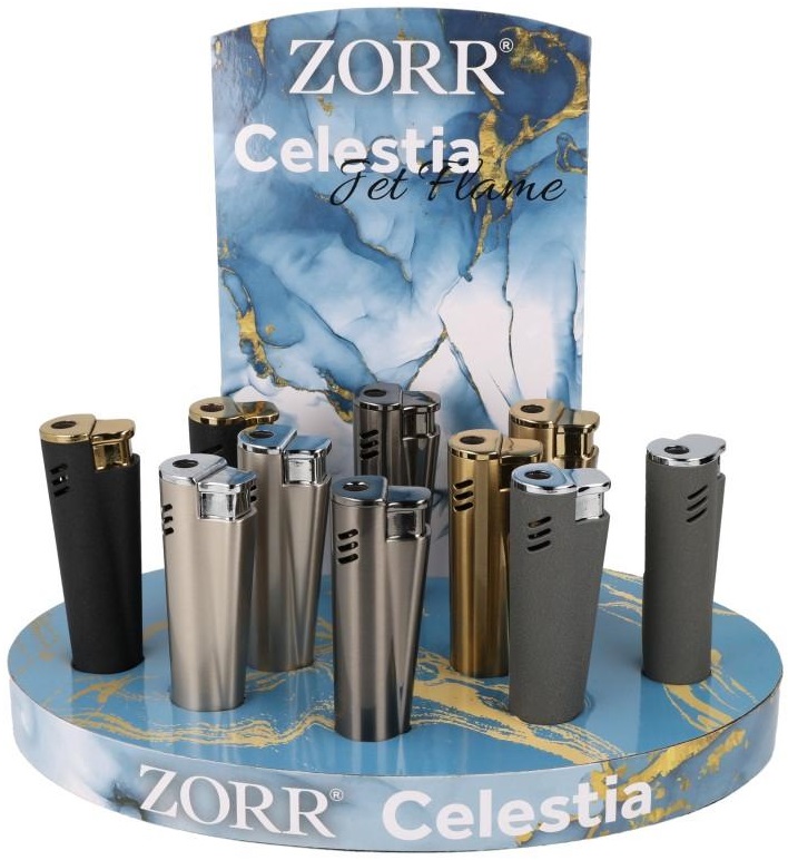 Turbo-Feuerzeug, nachfüllbar, ZORR Celestia, Jet-Flame, 5 Farben sortiert, im 10er Aufsteller (Feuerzeuge mit EAN)