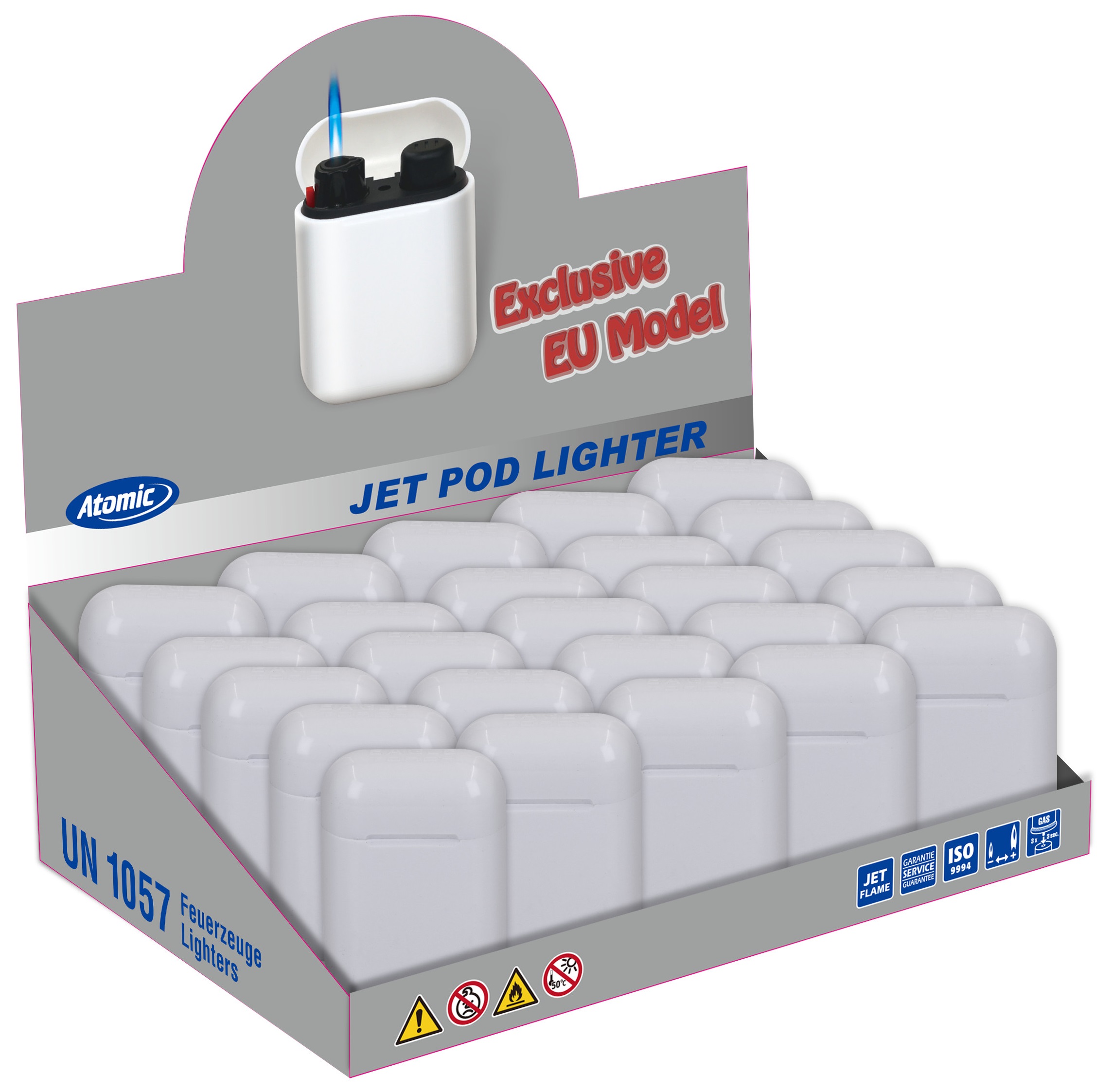Turbo-Feuerzeug, nachfüllbar, ATOMIC Jet-Pod weiß, blaue Jet-Flame, im 25er Aufsteller (Feuerzeuge mit EAN)