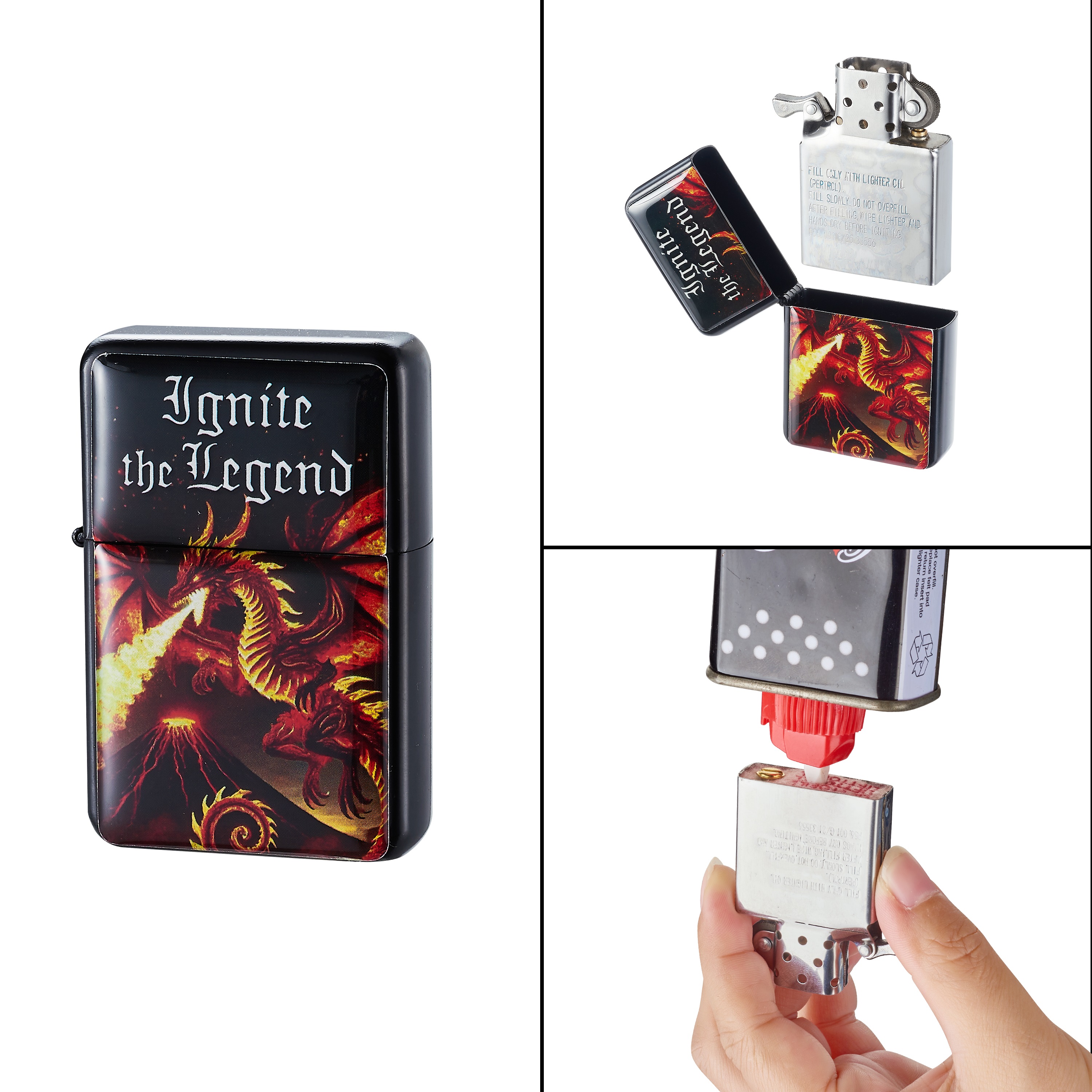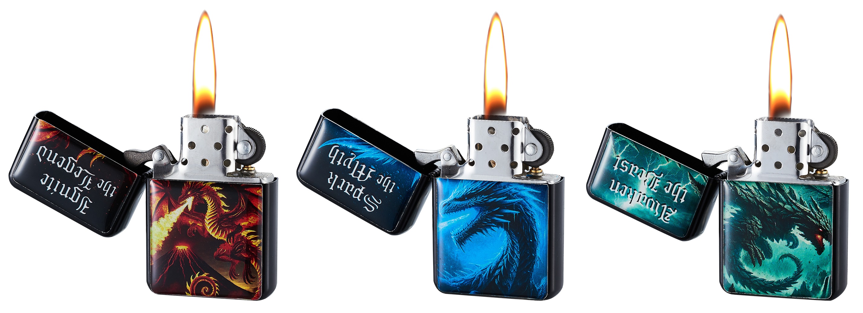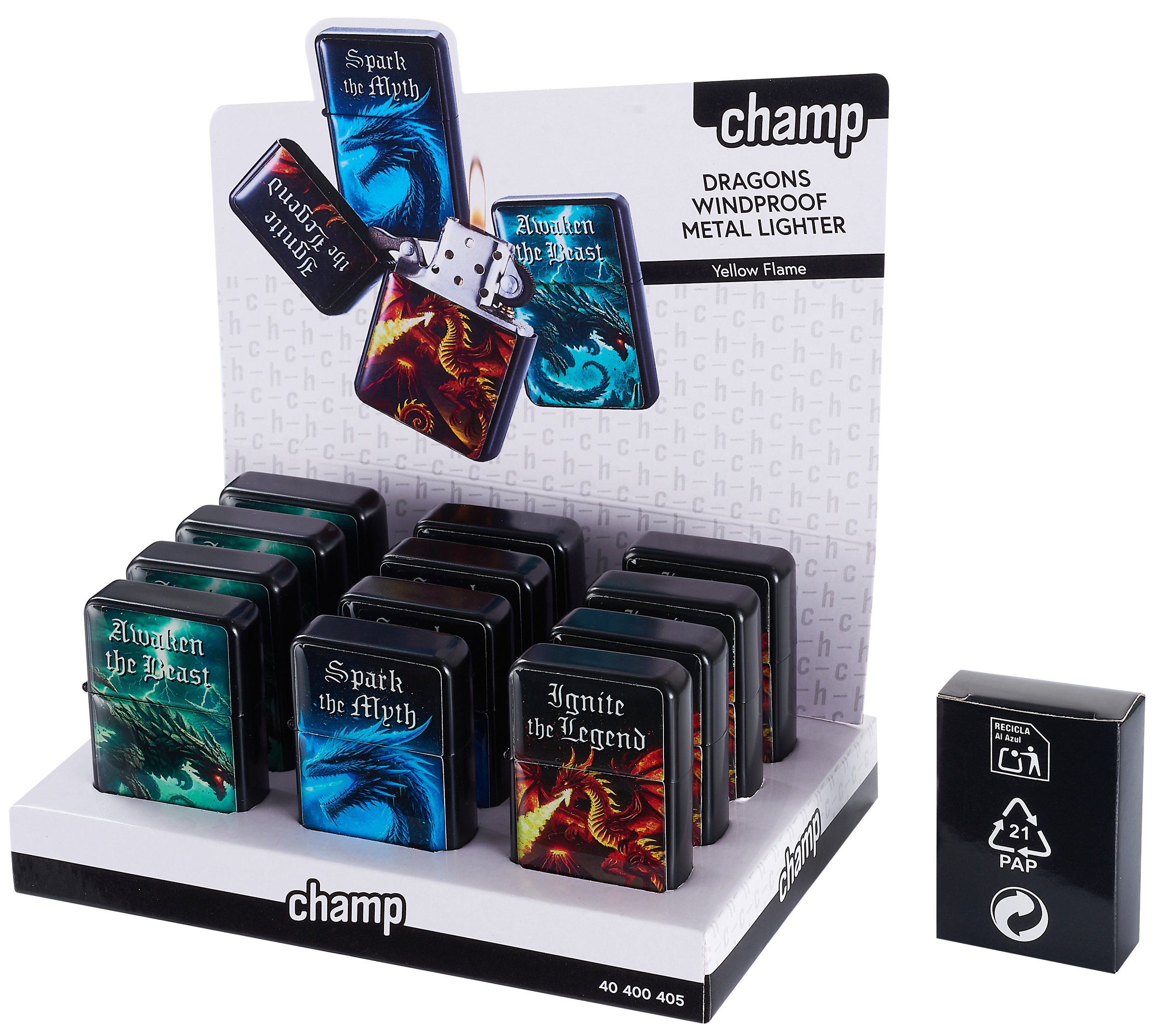 Sturmfeuerzeug CHAMP Dragons, 3 Motive/Farben sortiert, im 12er Aufsteller (Sturmfeuerzeuge mit EAN)