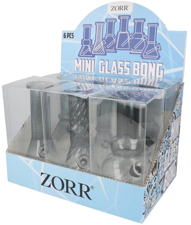 Mini Glasbong ZORR transparent, ca. 15cm, 6 verschiedene Formen, im 6er Aufsteller (in Einzelverapackung mit EAN)