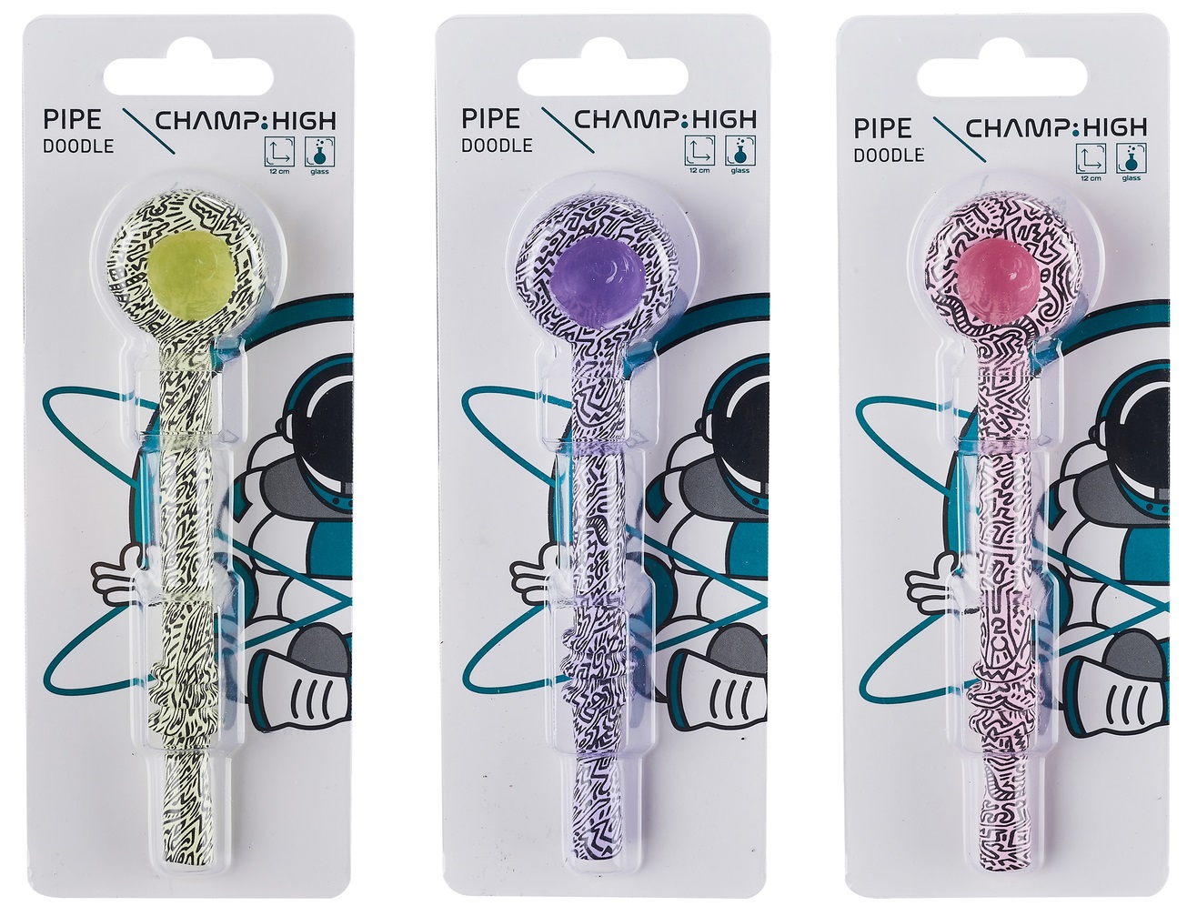 Galspfeife CHAMP HIGH Doodle, ca. 12cm, 3 Farben/Designs sortiert, auf Blister, im 12er Aufsteller (Bister mit EAN)