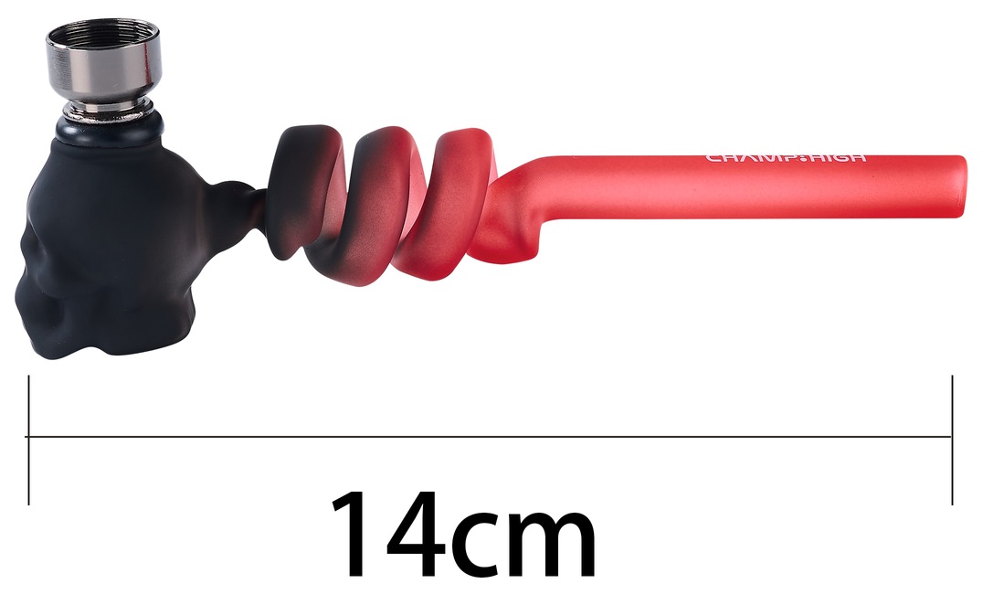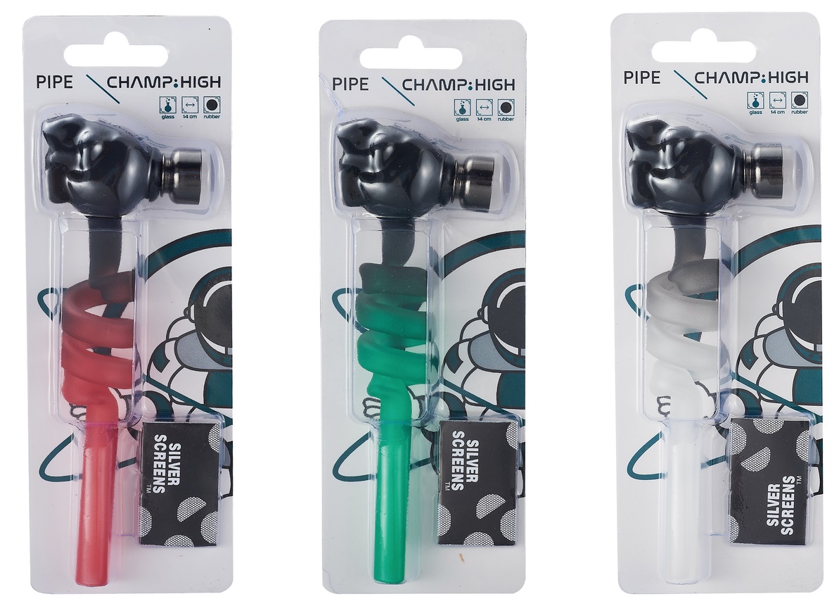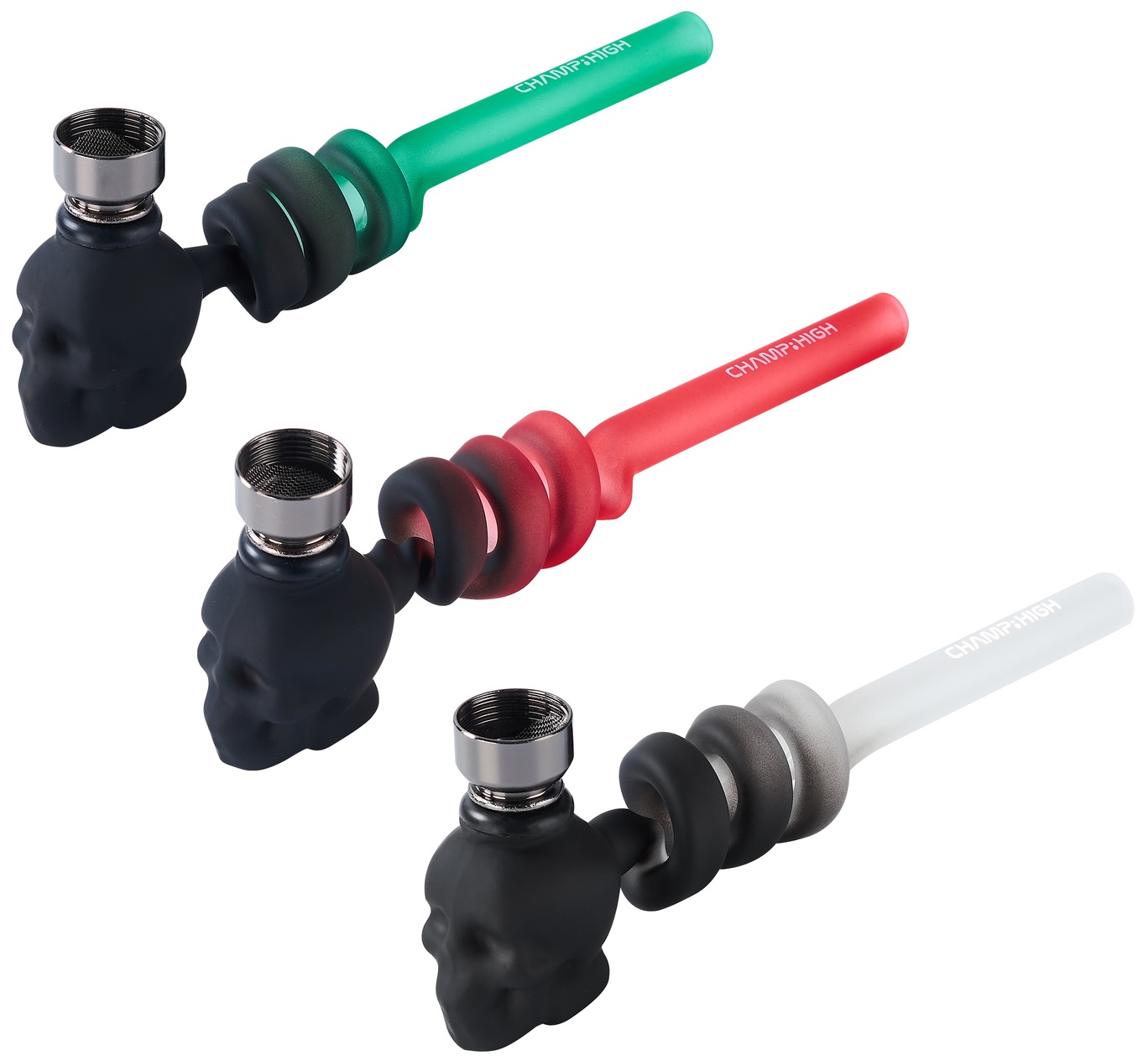 Glaspfeife CHAMP HIGH Skull Head, ca. 14cm, 3 Farben sortiert, incl. Siebe, auf Blister, im 12er Aufsteller (Bister mit EAN)