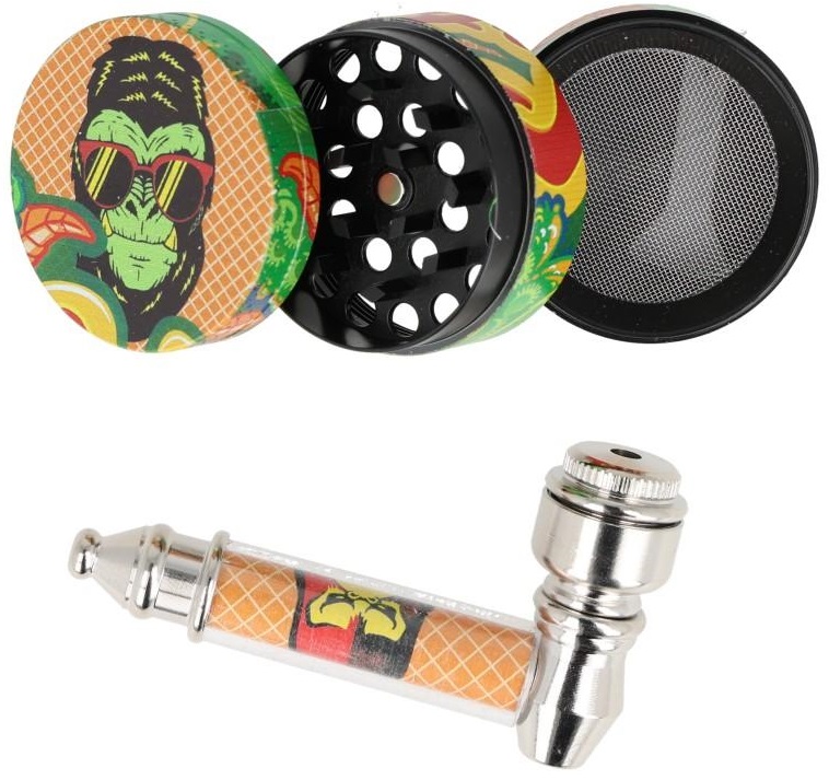 ZORR Herb Set, gelb, bestehend aus Schraubpfeife ca. 10cm und 3-tlg. Grinder D. ca. 4cm. In Einzelverpackung mit EAN