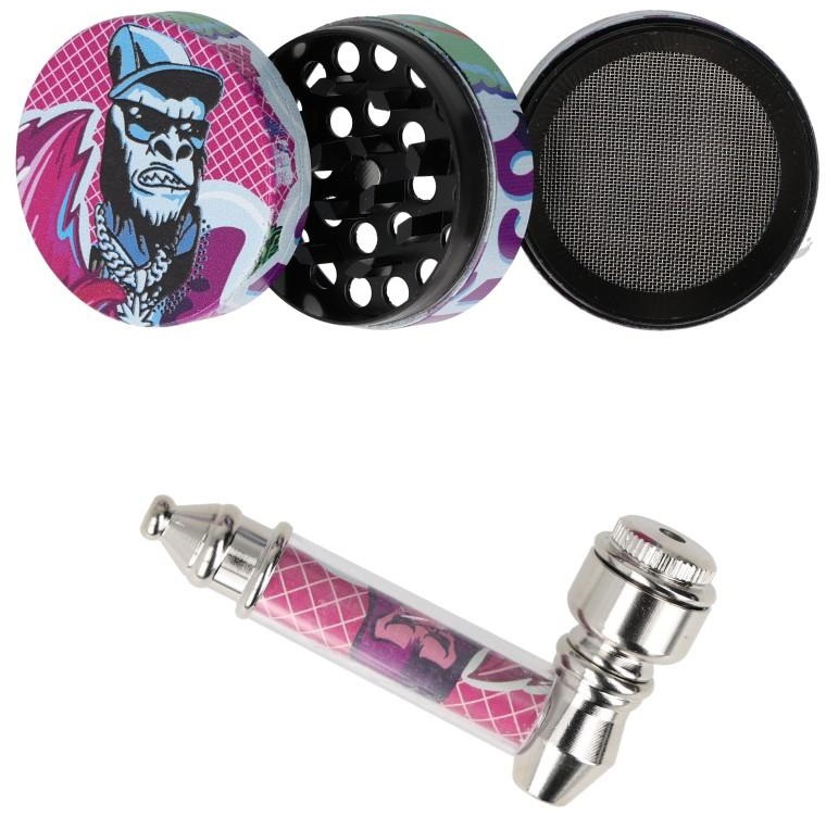 ZORR Herb Set, pink, bestehend aus Schraubpfeife ca. 10cm und 3-tlg. Grinder D. ca. 4cm. In Einzelverpackung mit EAN