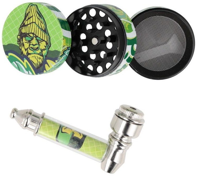 ZORR Herb grün, gelb, bestehend aus Schraubpfeife ca. 10cm und 3-tlg. Grinder D. ca. 4cm. In Einzelverpackung mit EAN