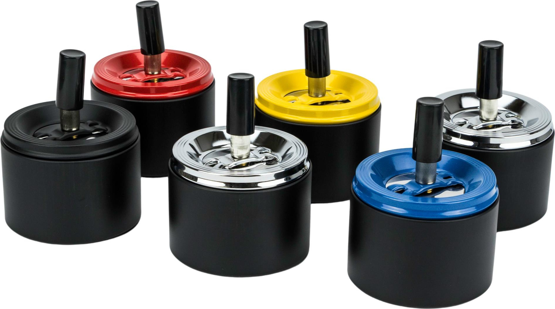 Drehaschenbecher Metall schwarz matt, 6 Farben sortiert, Durchmesser ca. 8cm, im 6er Aufsteller (Aschenbecher mit EAN)
